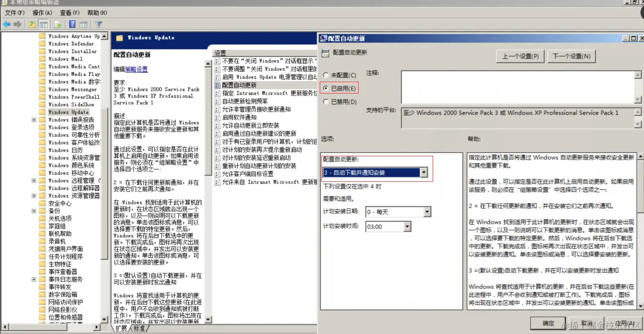 3、双击配置自动更新,在弹出的对话框中在【配置自动更新】选项区中选中【己启用】单选按钮,选择【配置自动更新】的模式,设定推荐为默认横式不用更改,并单击【下一设置】按钮。