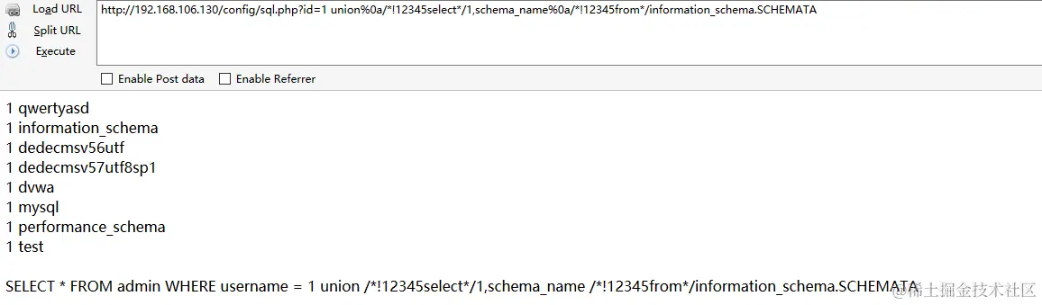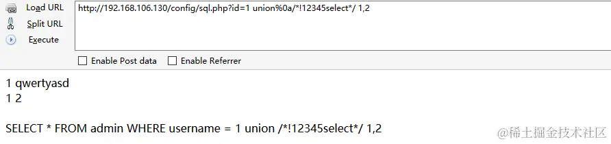 通过组合测试,可以发现 union%0a/*!12345select*/ 1,2 可以绕过防御。