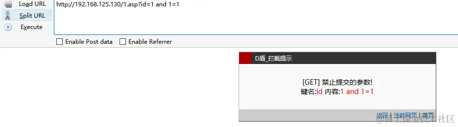 搭建IIS+ASP/ASPX+MSSQL环境,思路一致,只是语言与数据库特性有些许差异,继续来张D盾拦截图: