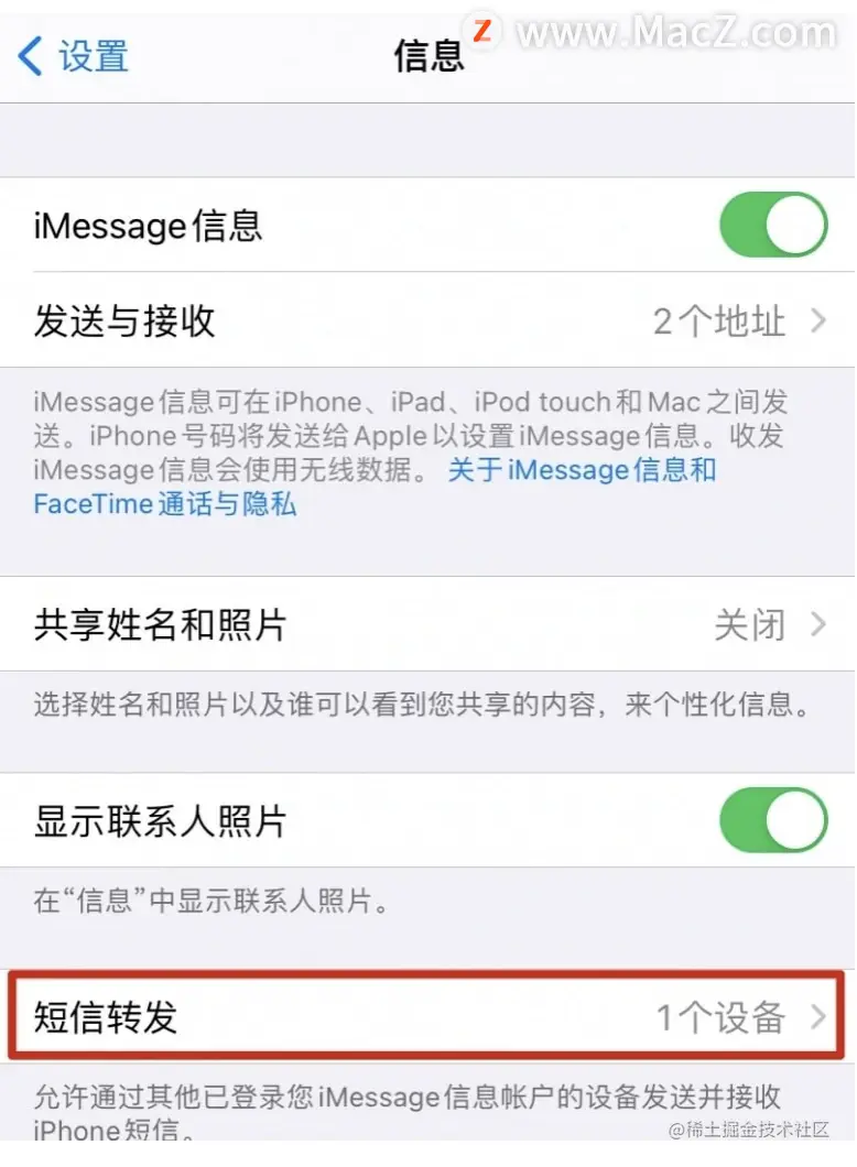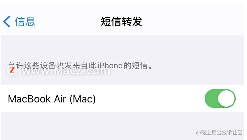 在短信转发中选中你的需要查看短信的 Mac 设备