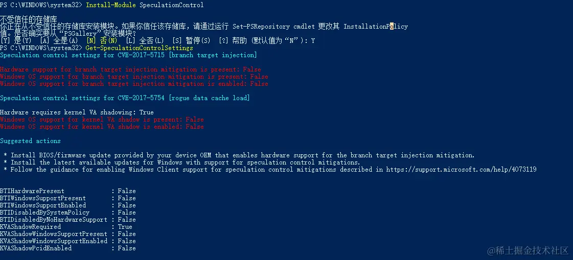 下面的Powershell命令,将下载并安装Powershell模块,用于测试Meltdown和Specter的缺陷。