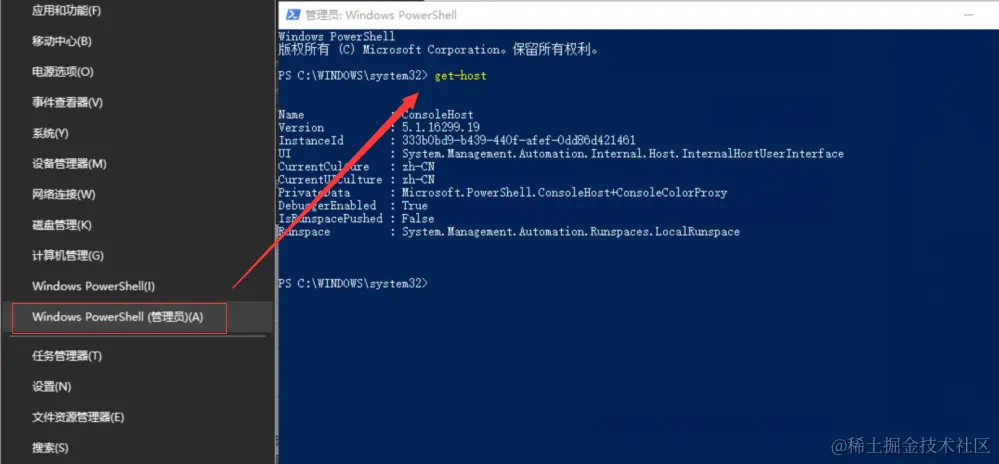 用户在启动PowerShell时,请确保是以管理员权限启动的,以便安装所需的模块。我的操作系统是window10 ,自带的powershell,右击开始菜单出现如图所示功能: