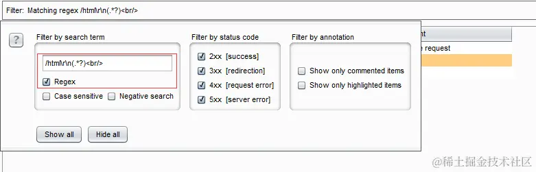 4、另外,可以将正则复制出来,在Filter里面填写正则并启用正则进行筛选。
