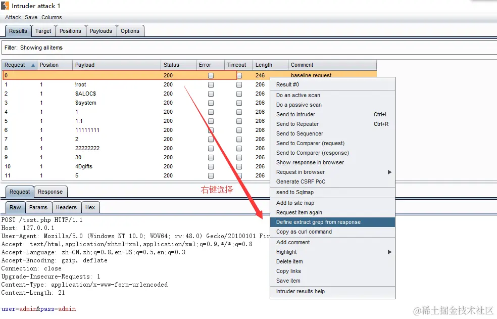 1、选择初始的数据包,右键发送到”Define extract grep from response”