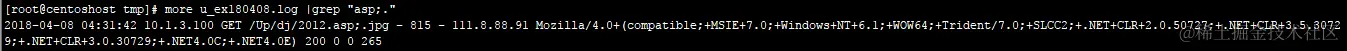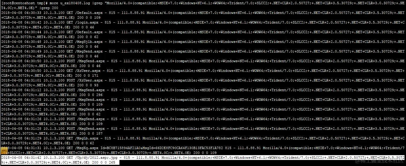 [root@centoshost tmp]# more u_ex180408.log |grep "Mozilla/4.0+(compatible;+MSIE+7.0;+Windows+NT+6.1;+WOW64;+Trident/7.0;+SLCC2;+.NET+CLR+2.0.50727;+.NET+CLR+3.5.30729;+.NET+CLR+3.0.30729;+.NET4.0C;+.NET4.0E)" |grep 200