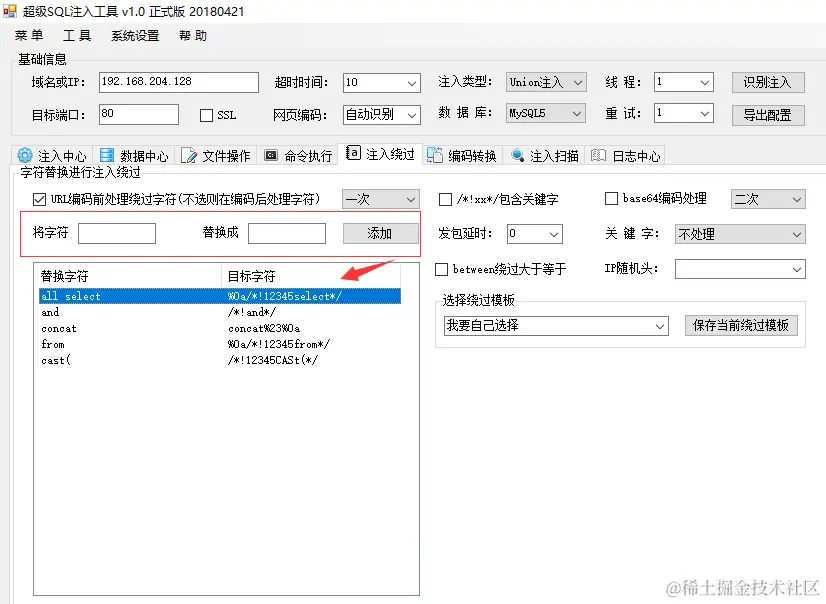 这边也分享一下,另一个比较简单的自动化注入的方法,就是使用超级SQL注入工具,利用这边提供的注入绕过模块,结合日志中心的测试记录,可以很方便的进行调试,然后保存绕过模板,方便下次调用。