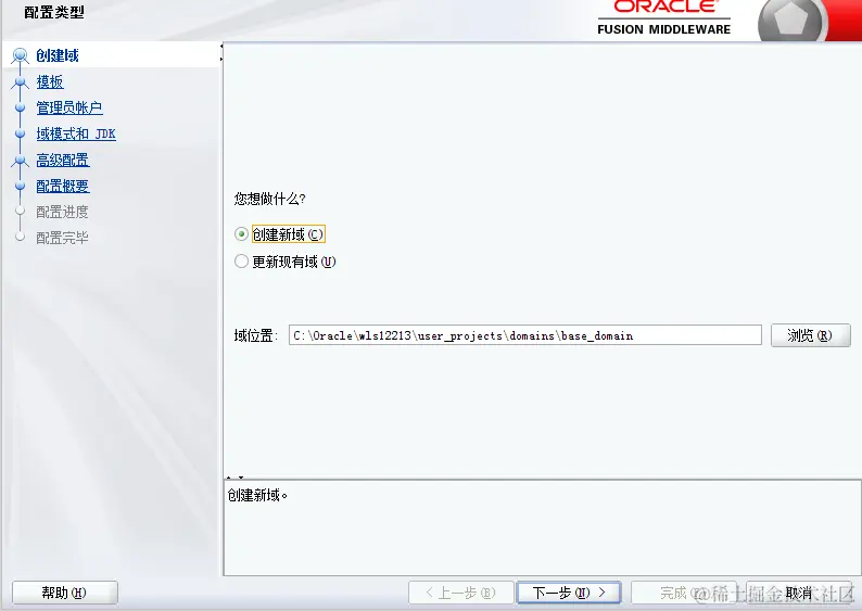3、上面步骤完后,进入<ORACLE_HOME>运行文件\oracle_common\common\bin\config.cmd进行domain的相关配置,其会启动一个Java界面做相关设置,一直下一步即可(注意记住服务器后台管理的账号密码,URL:http://localhost:7001/console/ 账户:weblogic/abc123!!!);