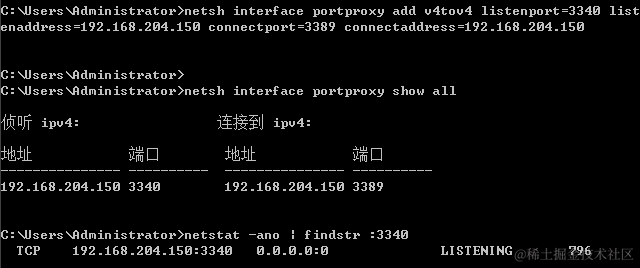 netsh interface portproxy add v4tov4 listenport=3340 listenaddress=192.168.204.150 connectport=3389 connectaddress=192.168.204.150