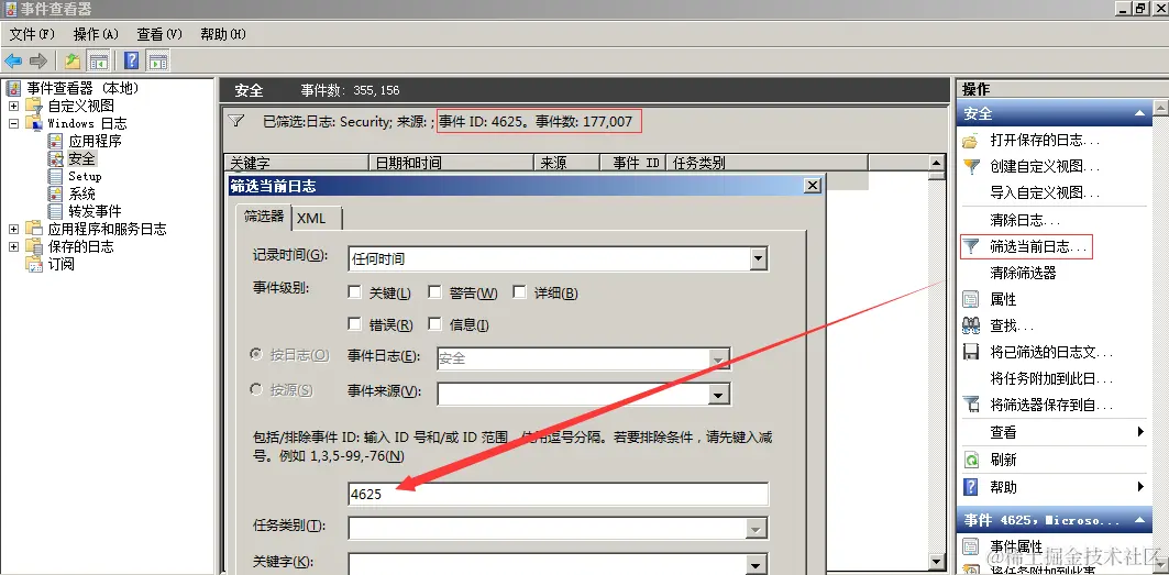 打开安全日志,在右边点击筛选当前日志, 在事件ID填入4625,查询到事件ID4625,事件数177007,从这个数据可以看出,服务器正则遭受暴力破解: