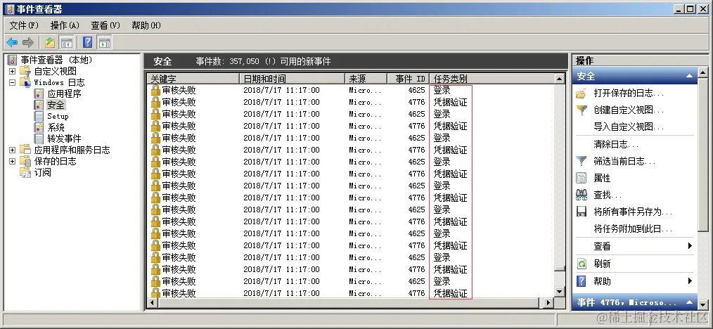 从昨天开始,网站响应速度变得缓慢,网站服务器登录上去非常卡,重启服务器就能保证一段时间的正常访问,网站响应状态时而飞快时而缓慢,多数时间是缓慢的。针对网站服务器异常,系统日志和网站日志,是我们排查处理的重点。查看Window安全日志,发现大量的登录失败记录: