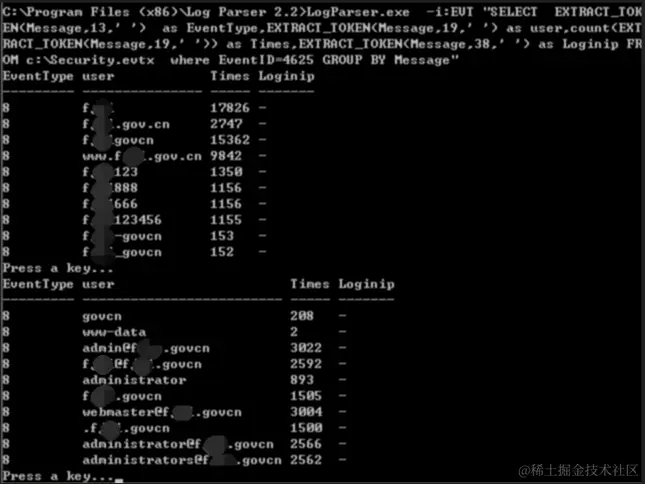 进一步使用Log Parser对日志提取数据分析,发现攻击者使用了大量的用户名进行爆破,例如用户名:fxxx,共计进行了17826次口令尝试,攻击者基于“fxxx”这样一个域名信息,构造了一系列的用户名字典进行有针对性进行爆破,如下图: