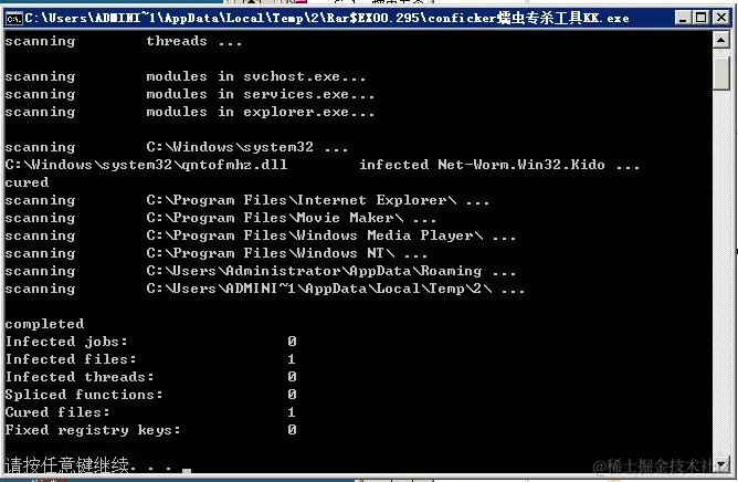 4、病毒处理:使用conficker蠕虫专杀工具对服务器进行清查,成功清除病毒。