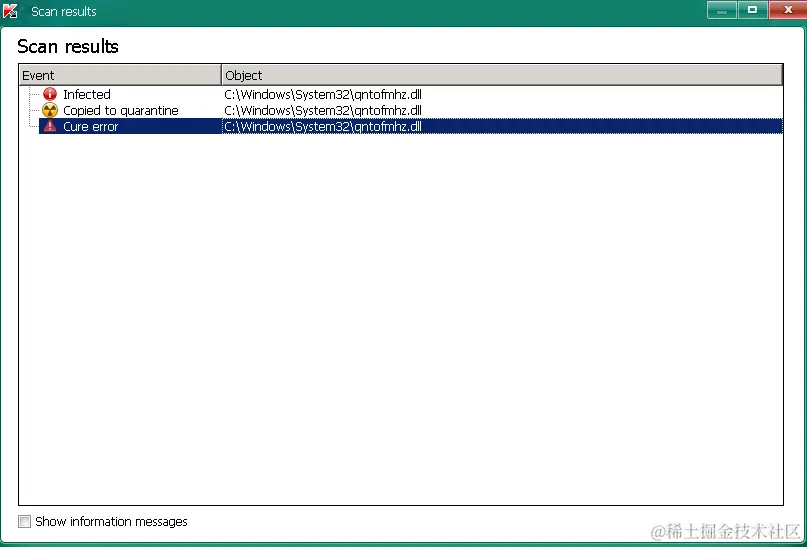 这里我们推测可以系统进程被病毒感染,使用卡巴斯基病毒查杀工具,对全盘文件进行查杀,发现c:\windows\system32\qntofmhz.dll异常: