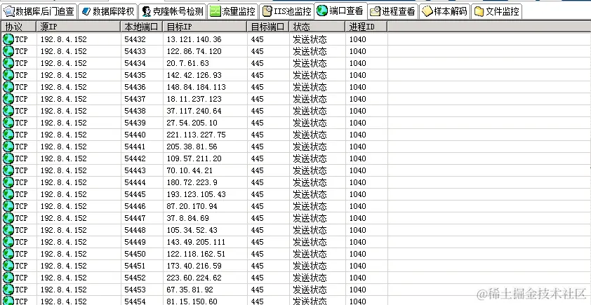 通过端口异常,跟踪进程ID,可以找到该异常由svchost.exe windows服务主进程引起,svchost.exe向大量远程IP的445端口发送请求: