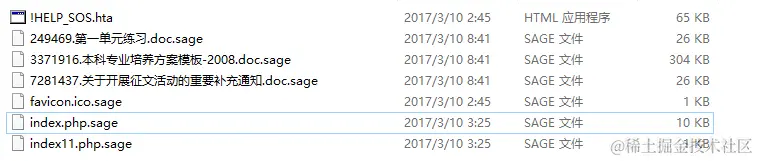 登录网站服务器进行排查,在站点目录下发现所有的脚本文件及附件都被加密为.sage结尾的文件,每个文件夹下都有一个!HELP_SOS.hta文件,打包了部分样本: