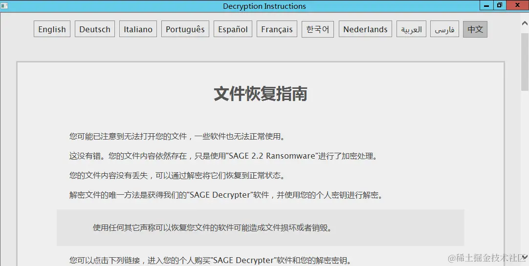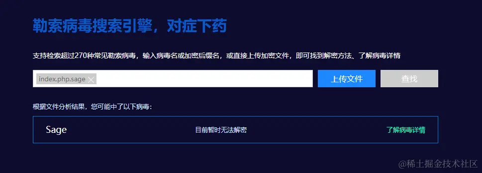 到这里,基本可以确认是服务器中了勒索病毒,上传样本到360勒索病毒网站(lesuobingdu.360.cn)进行分析:确认web服务器中了sage勒索病毒,目前暂时无法解密。