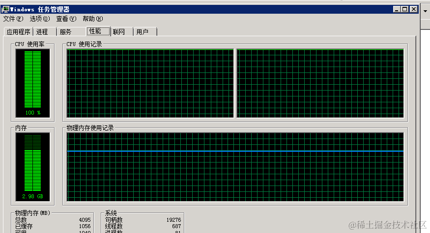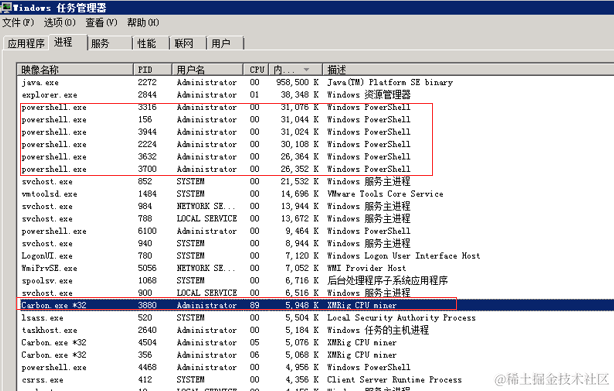 某天上午重启服务器的时候,发现程序启动很慢,打开任务管理器,发现cpu被占用接近100%,服务器资源占用严重。