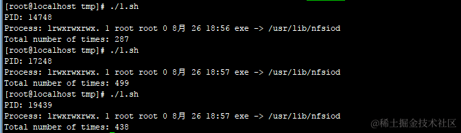 跑了三次脚本,可以发现短连接每次发起的进程Pid一直在变,但已经捕捉到发起该异常连接的进程源文件为 /usr/lib/nfsiod