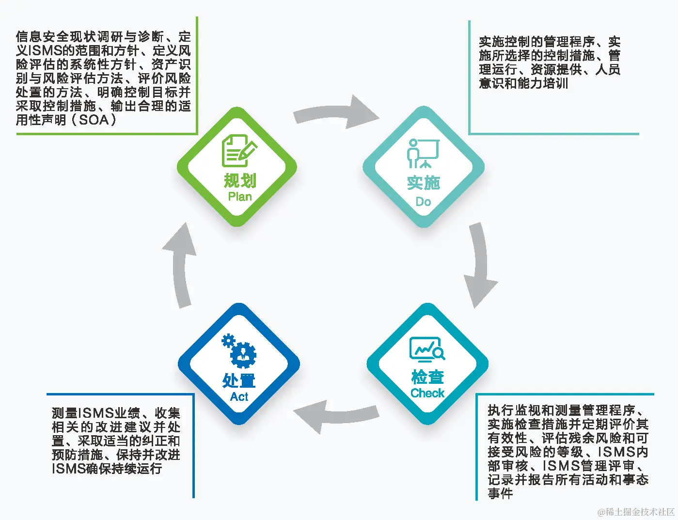Plan规划:信息安全现状调研与诊断、定义ISMS的范围和方针、定义风险评估的系统性方针、资产识别与风险评估方法、评价风险处置的方法、明确控制目标并采取控制措施、输出合理的适用性声明(SOA);