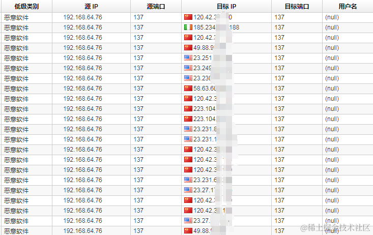 某天早上,小伙伴给我发了一个微信,说192.168.64.76 CPU现在负载很高,在日志分析平台查看了一下这台服务器的相关日志,流量在某个时间点暴涨,发现大量137端口的UDP攻击。
