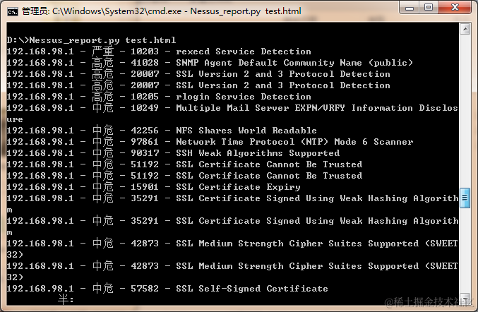 ****本文提供了一个demo,用于半自动化生成Nessus报告,有需要的话,可入库扩展,增加自动翻译,提供修复建议等。Nessus中文漏洞库可参见这个项目,NessusReportInChinese:半自动化将 Nessus 英文报告(csv格式)生成中文 excel ,中文漏洞库已有700多条常见漏洞。