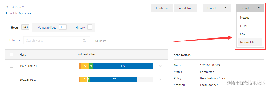 ****登录后通过New Scan创建扫描任务,扫描完成后,我们即可导出扫描报告。Nessus提供4种报告类型导出:
