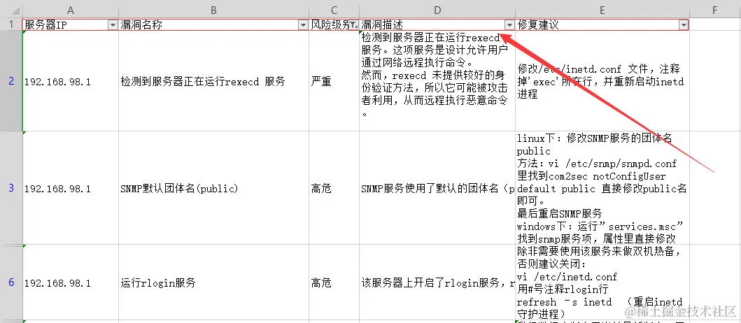 最终,同目录下,生成CSV文件,包含服务器IP、漏洞名称、风险级别、漏洞描述、修复建议。