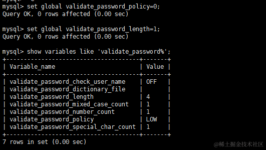 mysql> set global validate_password_length=1; # 设置密码复杂性要求密码最低长度为1