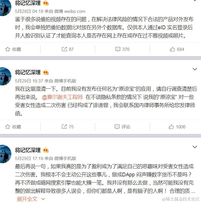 “原谅宝”事件前后 Bypass 2021-04-14 557 阅读1分钟 近几天,在网络中被网友称为原谅宝的软件,引起了热议,通过截图还原时间前后。 具体如下: 5 月 31 日,本来说要直播接受媒体采访的作者取消了原计划,同时删除了整个项目和数据库,因言论给他人造成不便而道歉告终。只是对这个项目的讨论并没有随着作者”删库跑路“而终结。