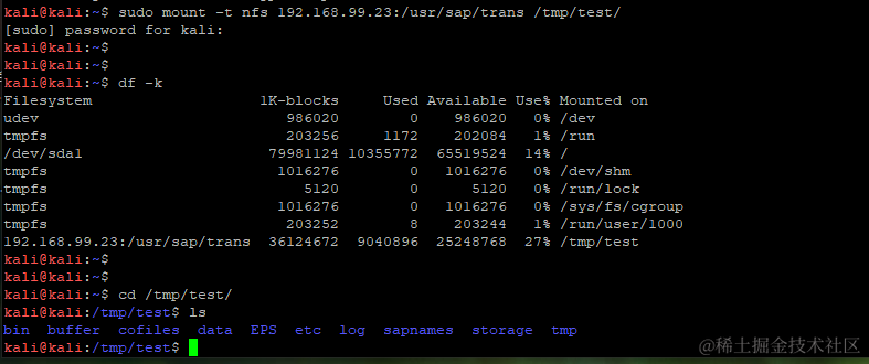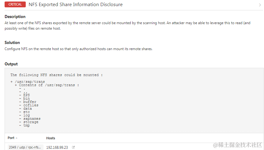NFS 共享信息泄露漏洞 Bypass 2021-04-14 508 阅读1分钟 漏洞情况: Nessus扫描到NFS共享信息泄露漏洞 漏洞验证: 1、扫描验证,确认漏洞存在,输出共享目录。 use auxiliary/scanner/nfs/nfsmount 2、将目标IP的目录挂载到本地目录。 mount -t nfs 192.168.99.23:/usr/sap/trans /tmp/test 3、指定NFS服务器输出目录列表 showmount -e 192.168.99.23