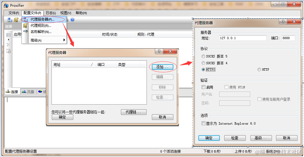 B、设置代理服务器和Fiddler代理设置匹配,配置文件-->代理服务器->添加。