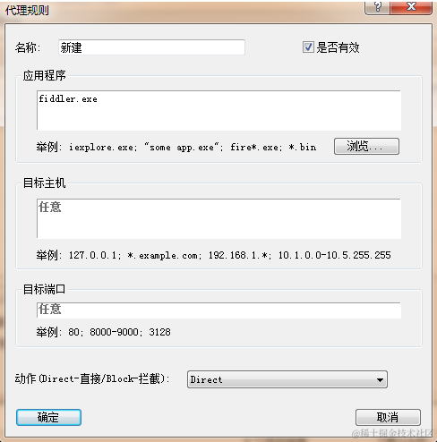 C、设置代理规则,一般默认的规则Fiddler.exe [auto-created] 即可,如没有,需要手动创建。