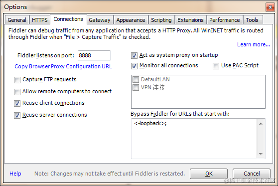 2、连接->Fiddler监听端口:8888 ,注意这个端口要和Proxifier的代理端口保持一致。