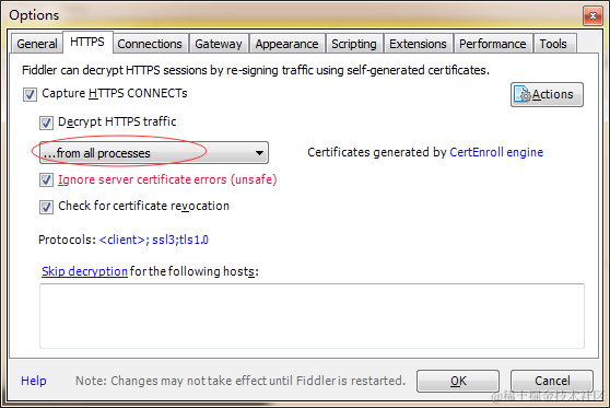 1、打开Fiddler->Tools->Options->HTTPS,然后全勾上,注意要选择“从所有进程”
