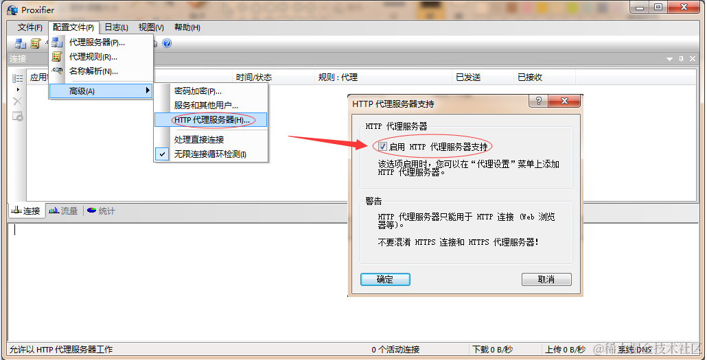 打开软件,依次选择,配置文件-->高级-->HTTP代理服务器-->启用HTTP代理服务器支持。