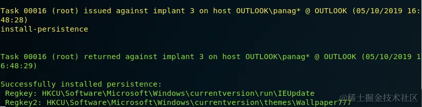 PoshC2支持各种持久性功能,包括注册表运行键的方法。以下命令将在目标主机中创建两个注册表项。