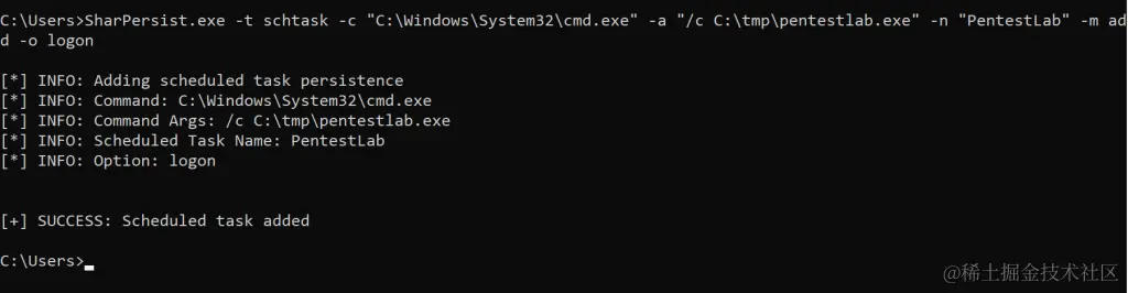通过计划任务在SharPersist中添加了关于持久性的多种功能。如果用户具有管理员级别的特权,则以下命令可以创建一个新的计划任务,该任务将在Windows登录期间执行。